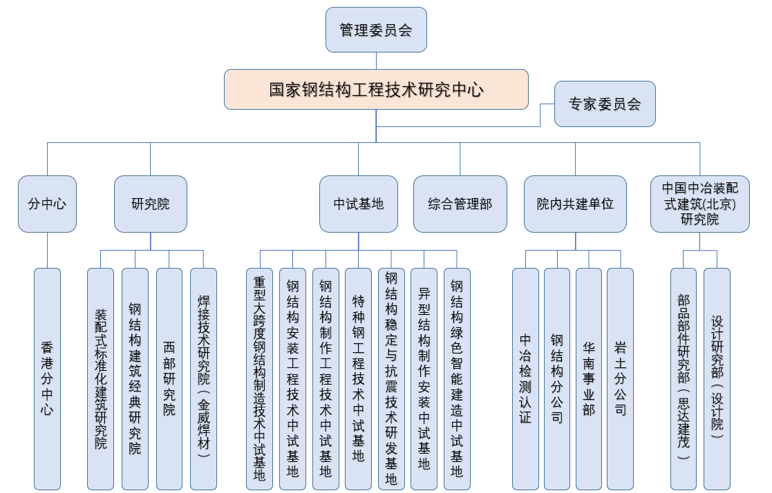 鋼結(jié)構(gòu)中心的組織機構(gòu)主要包括1個實體管理部門,1個分中心,4個研究院,7個中試基地,4家院內(nèi)共建單位,1個中國中冶研究院。這些分中心、研究院、中試基地的建成使鋼結(jié)構(gòu)中心與本領(lǐng)域的知名企業(yè)、學(xué)校、研究機構(gòu)建立了緊密長期的合作關(guān)系,在鋼結(jié)構(gòu)工程技術(shù)領(lǐng)域的研發(fā)、中試及生產(chǎn)任務(wù)中發(fā)揮著重要作用,有力地推動了新技術(shù)、新產(chǎn)品的產(chǎn)業(yè)化進(jìn)程。