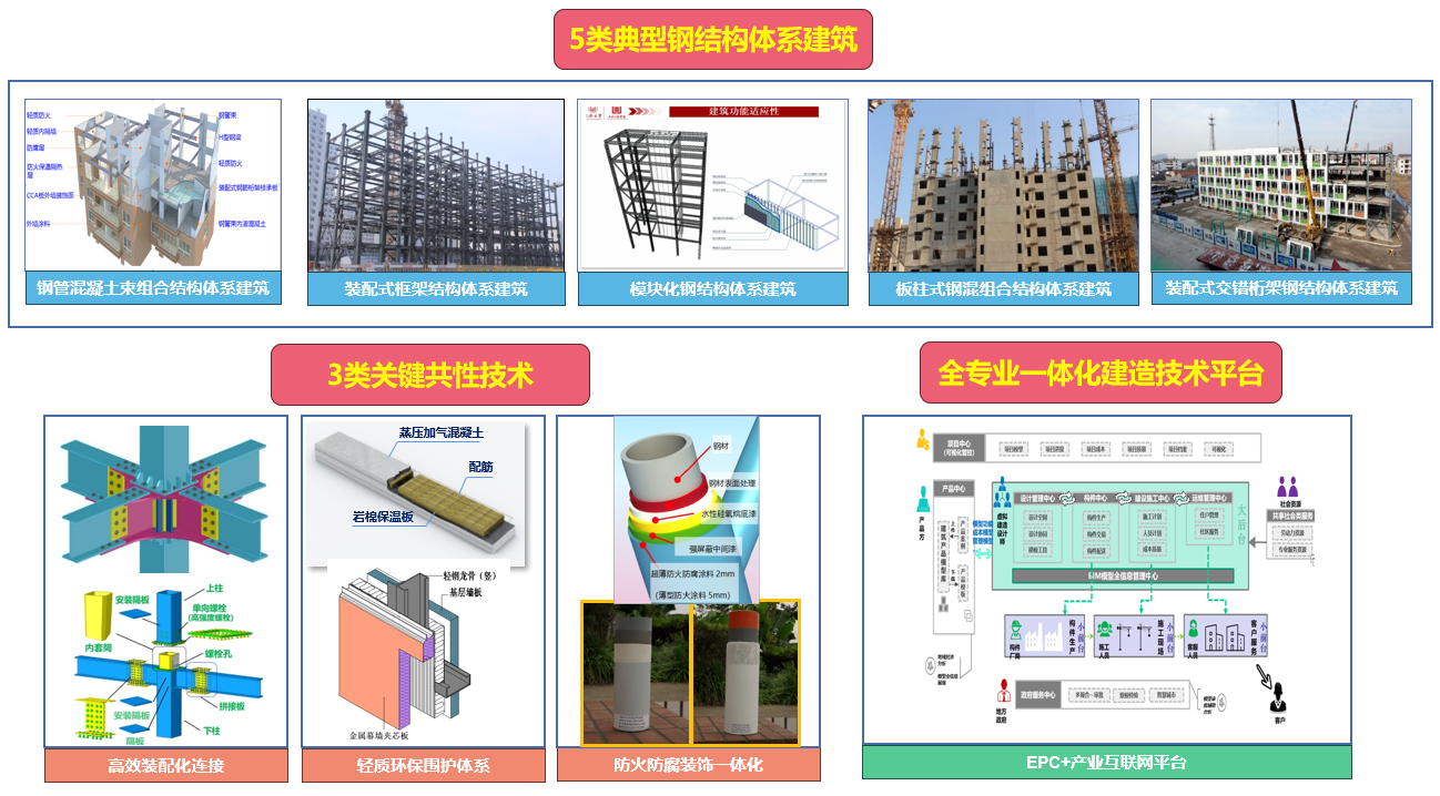 (1)鋼結(jié)構(gòu)建筑產(chǎn)業(yè)化關(guān)鍵技術(shù):研發(fā)了剪力墻、框架、模塊化、板柱結(jié)構(gòu)和交錯桁架等5類典型鋼結(jié)構(gòu)體系建筑產(chǎn)業(yè)化集成技術(shù),重點突破了鋼結(jié)構(gòu)建筑產(chǎn)業(yè)化需重點突破的高效裝配化連接、輕質(zhì)環(huán)保圍護體系、防火防腐裝飾一體化3類關(guān)鍵共性技術(shù),開發(fā)了全過程、全專業(yè)協(xié)同一體化智能建造技術(shù)平臺。