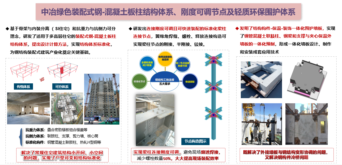 (3)中冶綠色鋼結(jié)構(gòu)裝配式建筑關(guān)鍵技術(shù):創(chuàng)新研發(fā)出適用于多高層住宅的裝配式鋼-混凝土板柱結(jié)構(gòu)體系,開發(fā)了與鋼結(jié)構(gòu)裝配式建筑配套的一體化輕質(zhì)節(jié)能圍護墻板產(chǎn)品,提出了中冶綠色鋼結(jié)構(gòu)裝配式建筑產(chǎn)業(yè)化成套技術(shù)、裝備、工藝和標(biāo)準(zhǔn)體系,實現(xiàn)了規(guī)模化應(yīng)用。